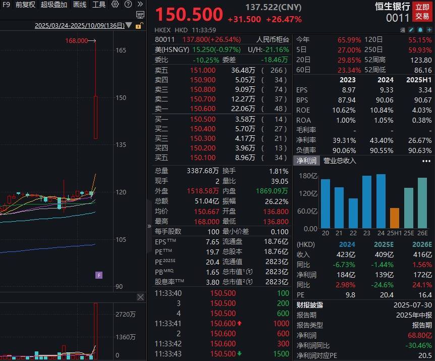 【大河财立方消息】10月9日盘中,恒生银行股价大涨26.47%配资股票投资,报150.5港元/股。